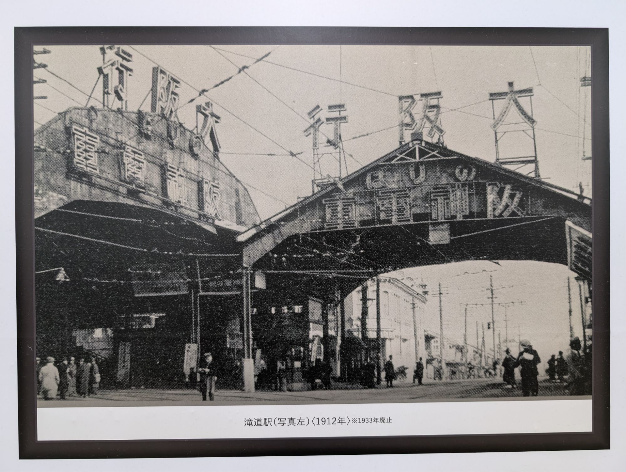 滝道駅は1912年に神戸市中央区に開業した阪神電鉄の地上駅で、現在の神戸三宮駅の前身にあたります。布引の滝へ続く道に由来する駅名で、「神戸駅」とも呼ばれていました。市電との乗り継ぎも可能で、当時は鉄骨屋根や電飾が施された近代的な駅でしたが、1933年に地下化に伴い廃止されました。神戸の鉄道史を語るうえで欠かせない存在です。
