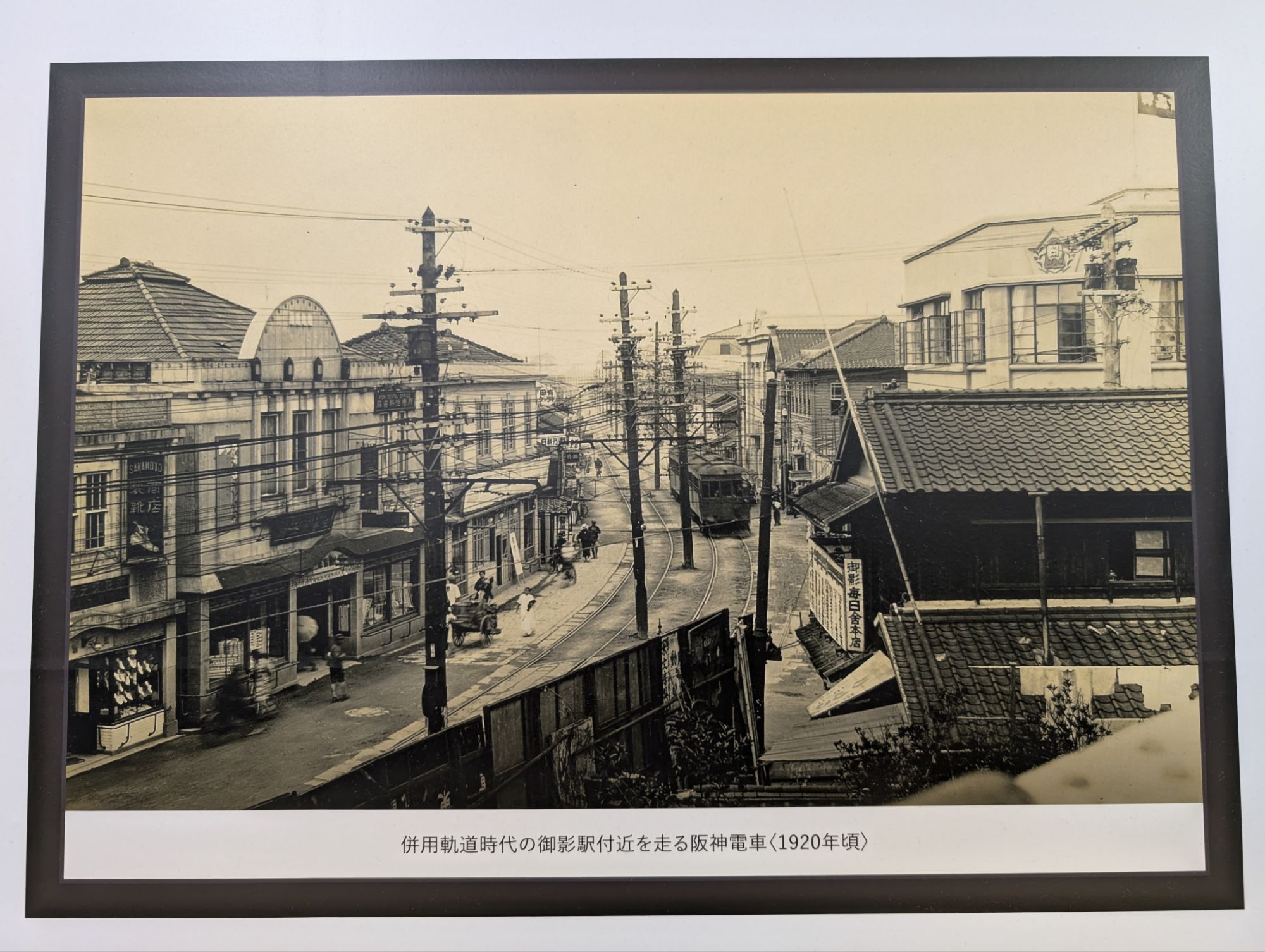 1920年頃、阪神電車は御影駅付近を併用軌道で走っていました。道路上に敷かれたレールを走る姿は、当時の街並みに溶け込んだ風景そのもの。後に安全性とスピード向上のため高架化され、併用軌道は姿を消しました。写真はその貴重な過渡期を伝えています。