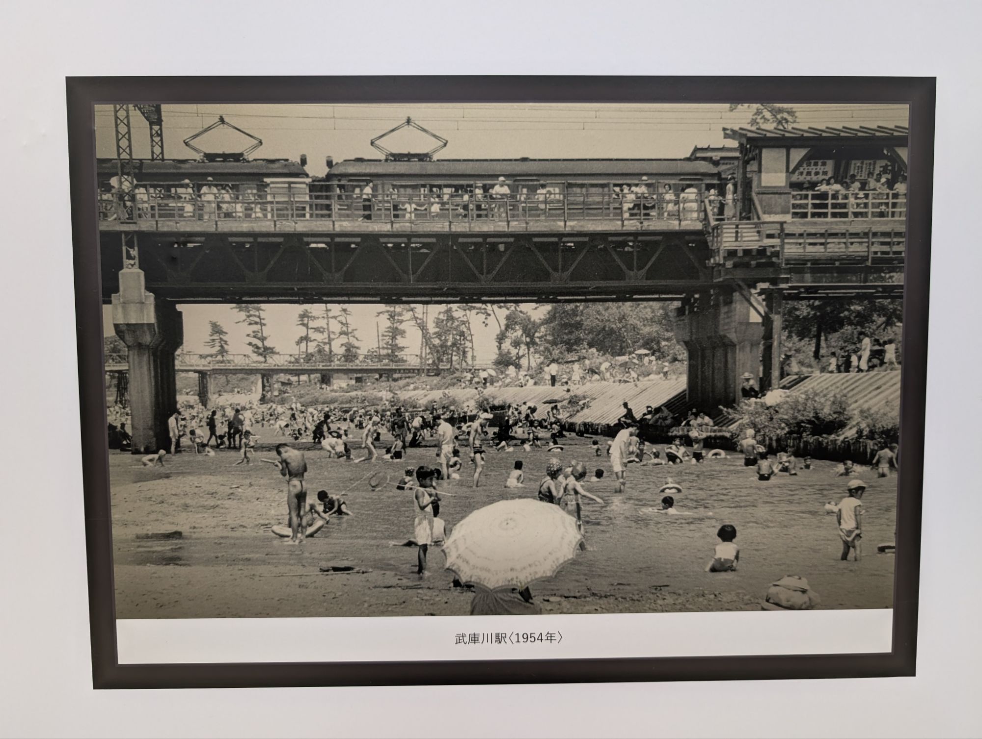 武庫川駅は、阪神電鉄本線の開業とともに1905年に設置され、1954年当時は武庫川の橋梁上にホームがある珍しい構造でした。尼崎市側と西宮市側の両方に改札口があり、地域の交通の要として機能。写真は、川の上に浮かぶような駅の姿をとらえた貴重な記録です。