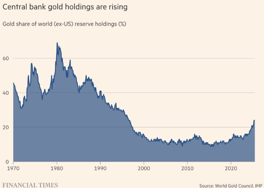 中央銀行準備金における金の割合が30年ぶりの高水準に達したことは、