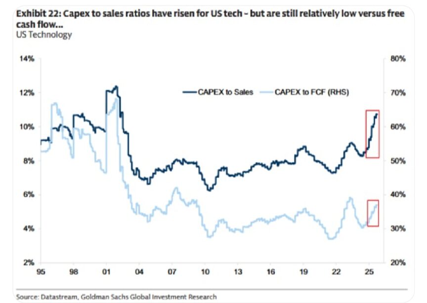 CapEx対売上高比率の急増が示すように、AIブームを背景に企業はかつてない規模の設備投資を行っています。財務の健全性